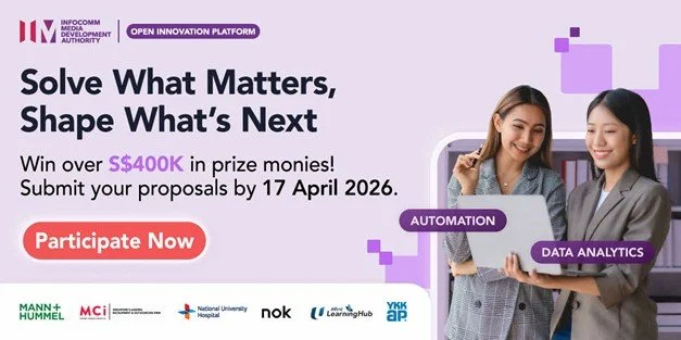 Ready to scale your solution? Win up to $400,000 in the latest IMDA Open Innovation Platform Call! Partner with leading organisations like MANN+HUMMEL, NTUC LearningHub, and National University Hospital, and more to tackle real-world challenges across manufacturing, education, healthcare and beyond. Submit your proposal and make an impact today.